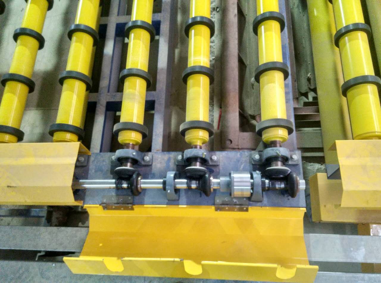 在云南云騰建材600噸浮法冷端項(xiàng)目上,玻機(jī)公司成功設(shè)計(jì)出末輥可超越式主線落板。該設(shè)備減少了末輥損壞周期,降低了對(duì)末輥的磨損。主要原理是在傳動(dòng)通軸上,末輥與倒數(shù)第二支輥?zhàn)又g的位置斷開(kāi),按照轉(zhuǎn)速和轉(zhuǎn)矩等參數(shù)設(shè)計(jì)了超越離合器。正常輸送時(shí),末輥如同普通輥?zhàn)樱恍枰浒鍟r(shí),超越離合器會(huì)實(shí)現(xiàn)末輥的線速度跟隨主線接板輥道的線速度,從而減小因速度差導(dǎo)致的玻璃板對(duì)末輥的磨損。現(xiàn)該設(shè)備在云騰600噸冷端線上運(yùn)轉(zhuǎn)良好。