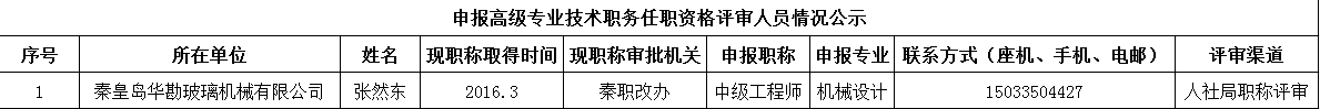 秦皇島華勘玻璃機械有限公司申報中級專業技術職務任職資格評審人員情況公示