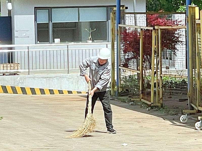 午休時分的陽光斜斜地灑在附屬樓前的道路上,一個熟悉的身影正在專注地清掃著落葉。那是供應部的庫管員盧海峰,他弓著背,手中的掃把有節奏地劃過地面,揚起細小的塵埃。這本不是他的分內工作,卻成了他工余的習慣。